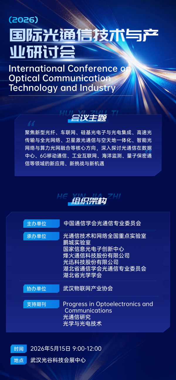 2026年5月15日,中國(guó)光谷科技會(huì)展中心,2026國(guó)際光通信技術(shù)與產(chǎn)業(yè)研討會(huì)——聚焦超高速、智能化、空天地一體化,探尋下一代光通信的真實(shí)邊界。